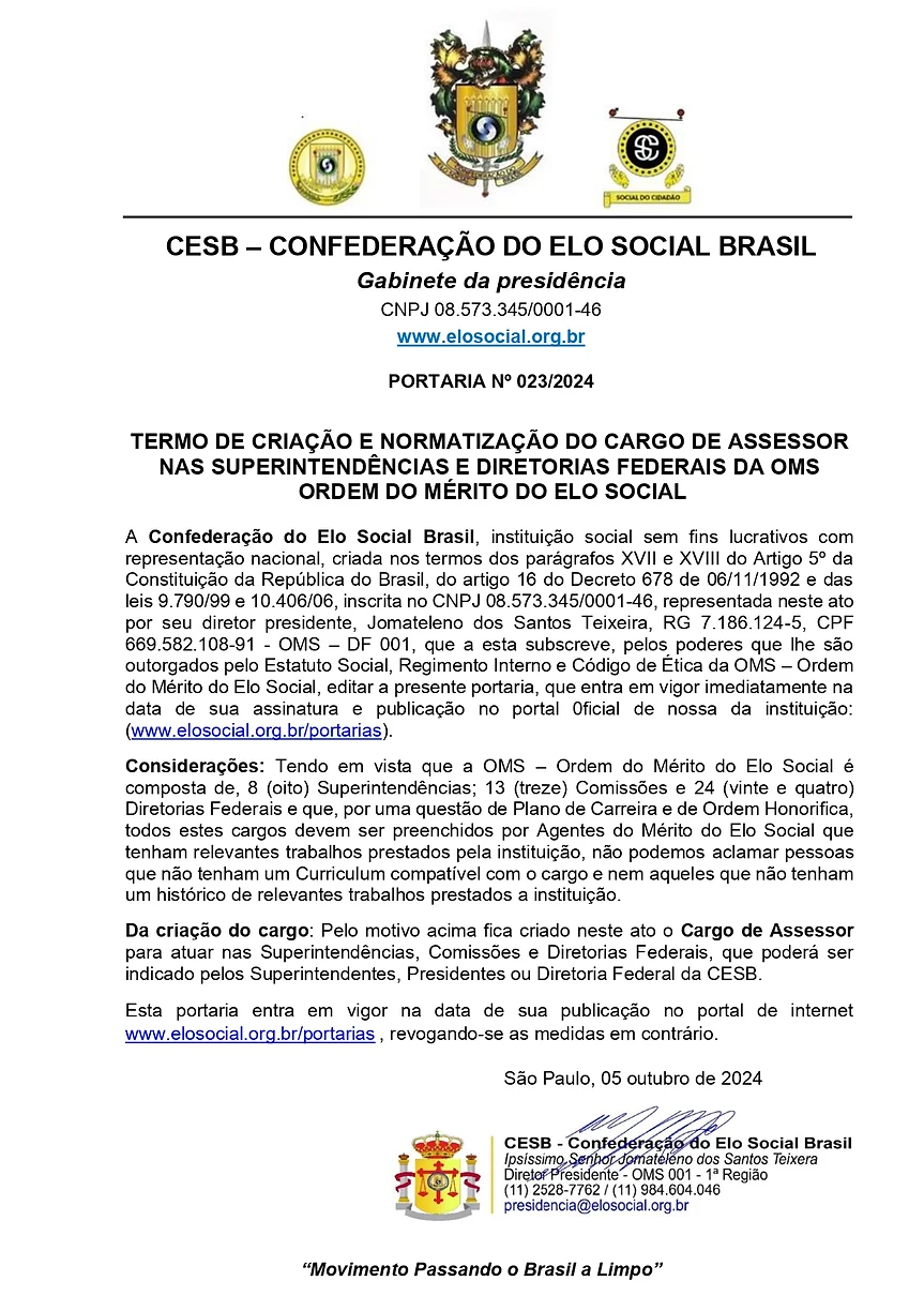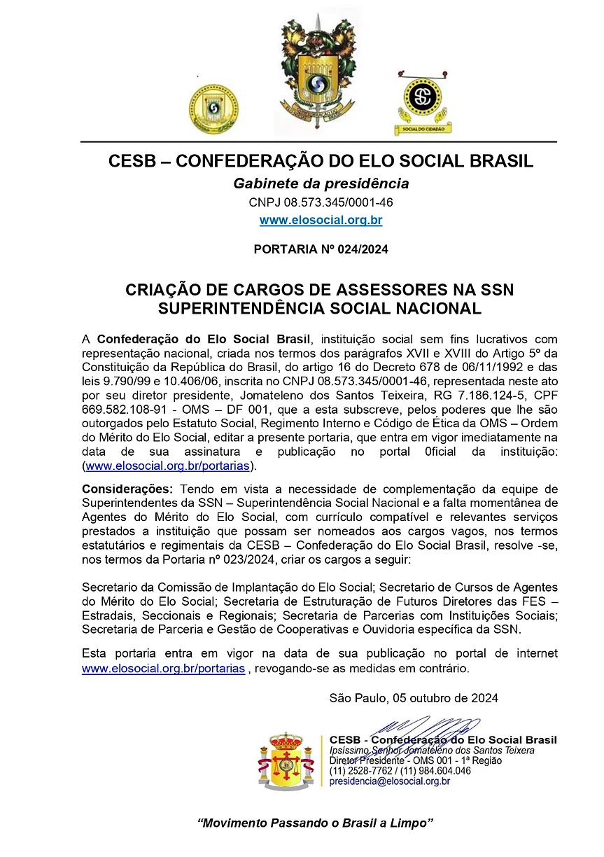 Com base na Portaria nº 023/2024 a CESB - Confederação do Elo Social Brasil, cria na SSN – Superintendência Social Nacional da OMS atraves da Portaria nº 024/2024 as: Secretaria de Cursos de Agentes do Mérito do Elo Social; Secretaria de Estruturação de Futuros Diretores das FES – Estradais, Seccionais e Regionais; Secretaria de Parcerias com Instituições Sociais; Secretaria de Parceria e Gestão de Cooperativas e Ouvidoria específica da SSN. Secretárias de.