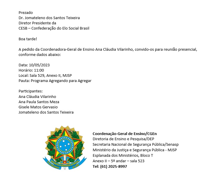 A Coordenação Geral de Ensino/CGE, Diretoria de Ensino e Pesquisa/DEP da Secretaria Nacional de Segurança Pública/Senasp, Ministério da Justiça e Segurança Pública – MJSP, agendou para o dia 10/05/2023, às 11h, na sala 529, Anexo II, MJSP, a apresentação do Programa Agregando para Agregar, criado pela CESB – Confederação do Elo Social Brasil –, que poderá ser implantado em todos os presídios do Brasil.